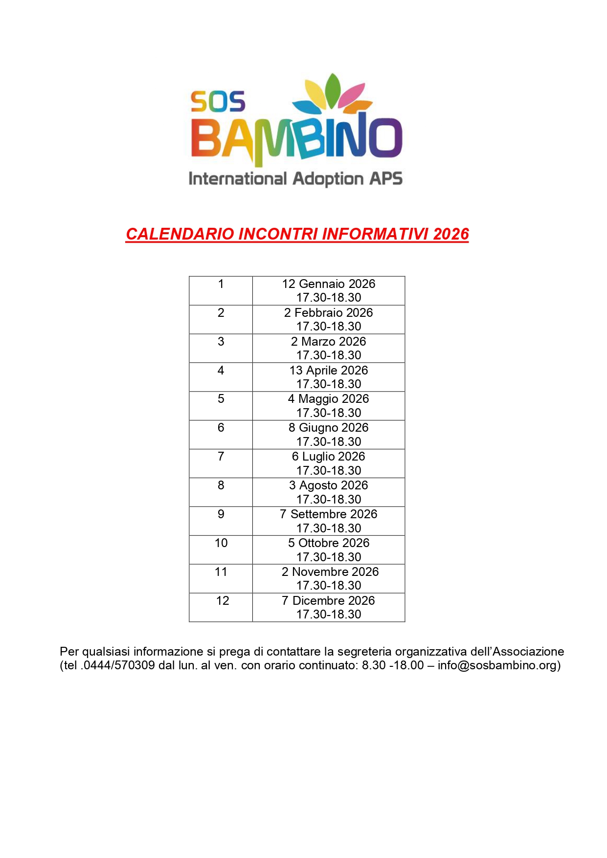 ECCO IL CALENDARIO DI TUTTI GLI INCONTRI INFORMATIVI GRATUITI DI SOS BAMBINO DELL’ANNO 2026! Clicca qui per vederlo: Calendario incontri informativi 2026